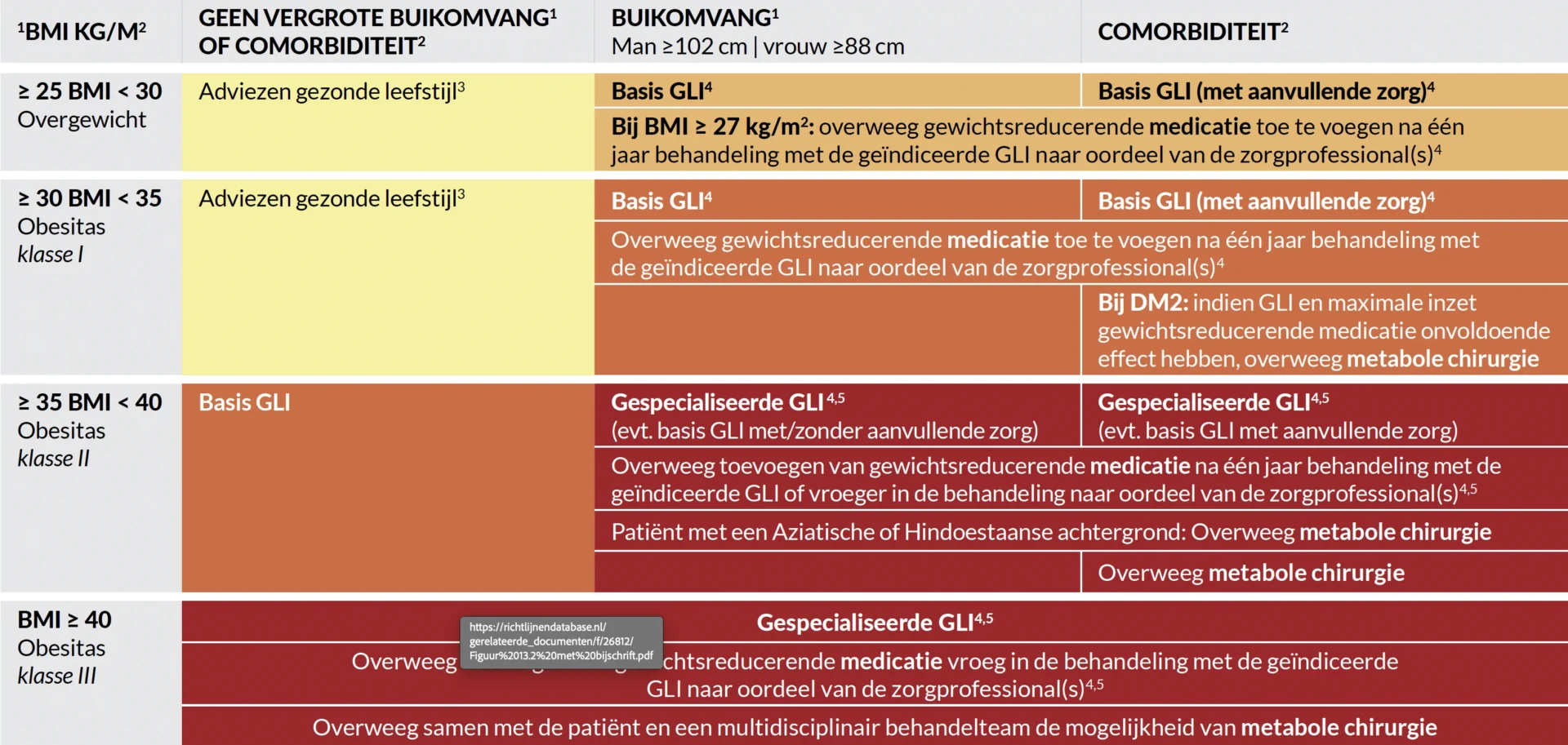 - overweeg toevoegen van gewichtsreducerende medicatie na één jaar behandeling met de geïndiceerde GLI of vroeger in de behandeling naar oordeel van de zorgprofessional(s)